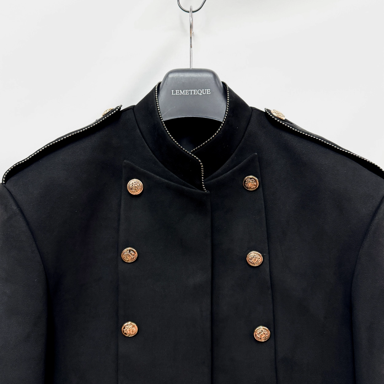 BLACK SUEDE LEATHER CROPPED NAPOLEON JACKET WITH GOLD BUTTON