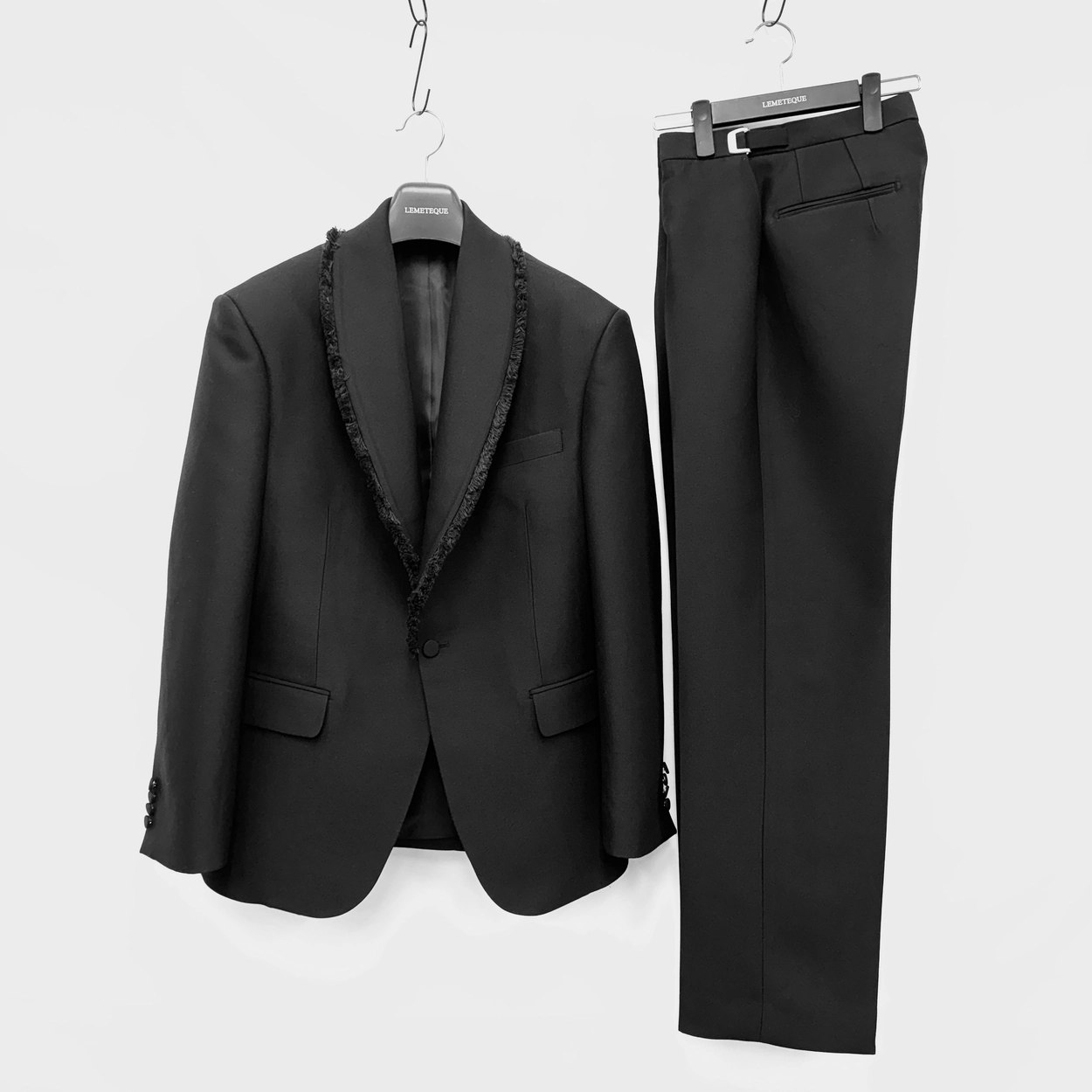 BLACK SILK WOOL FRINGED SHAWL COLLAR SINGLE SUIT WITH BACK STRAP