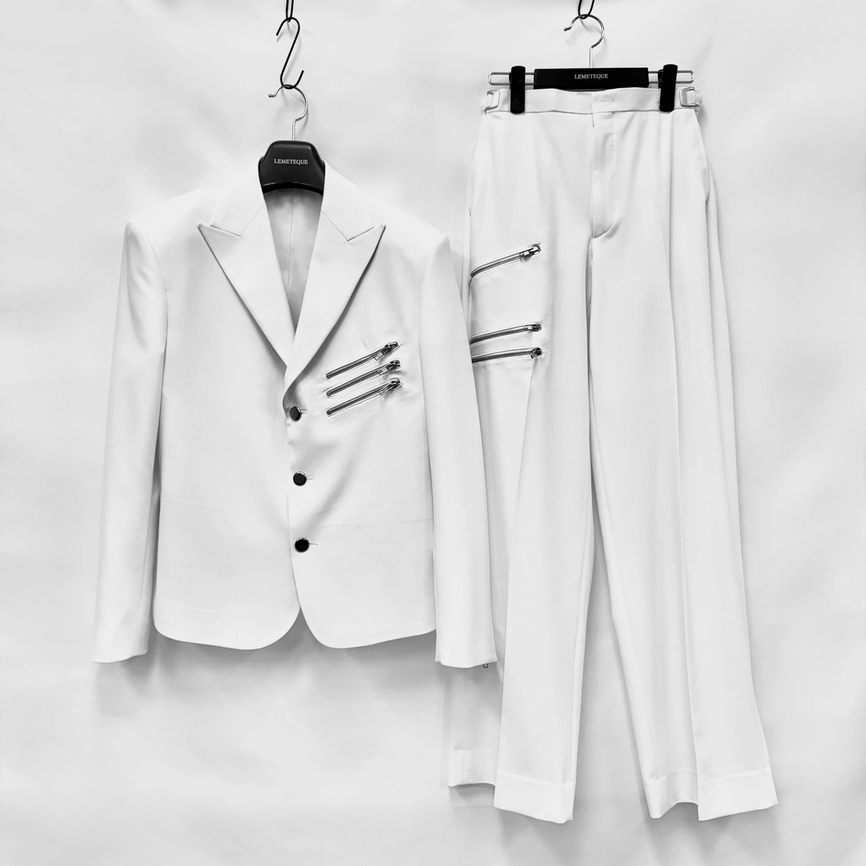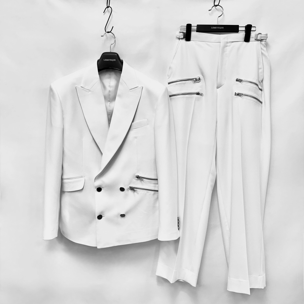 WHITE ZIP DOUBLE SUIT WITH WIDE PANTS