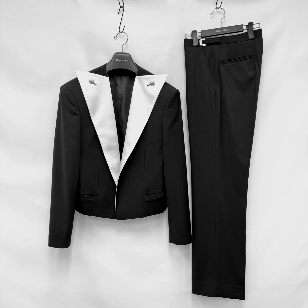 BLACK & WHITE SATIN SILK LAPEL CROPPED SINGLE SUIT