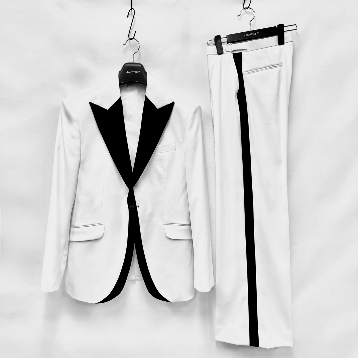 WHITE & BLACK SATIN LAPEL SINGLE SUIT WITH WIDE PANTS