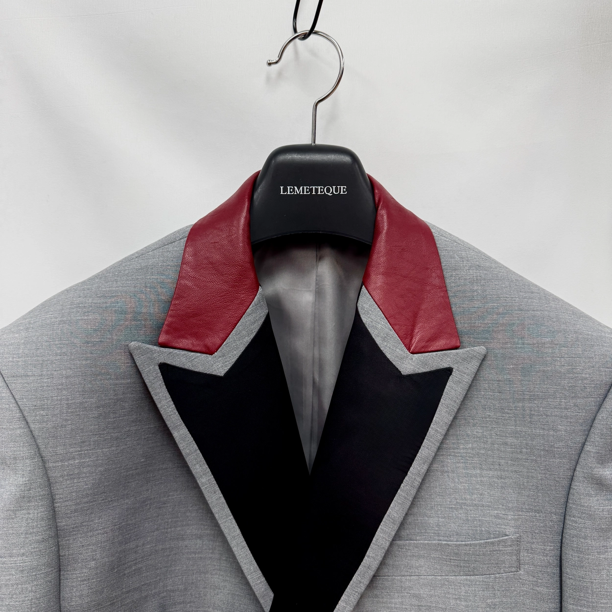 GREY & BLACK SATIN SILK DOUBLE SUIT WITH RED LEATHER LAPEL