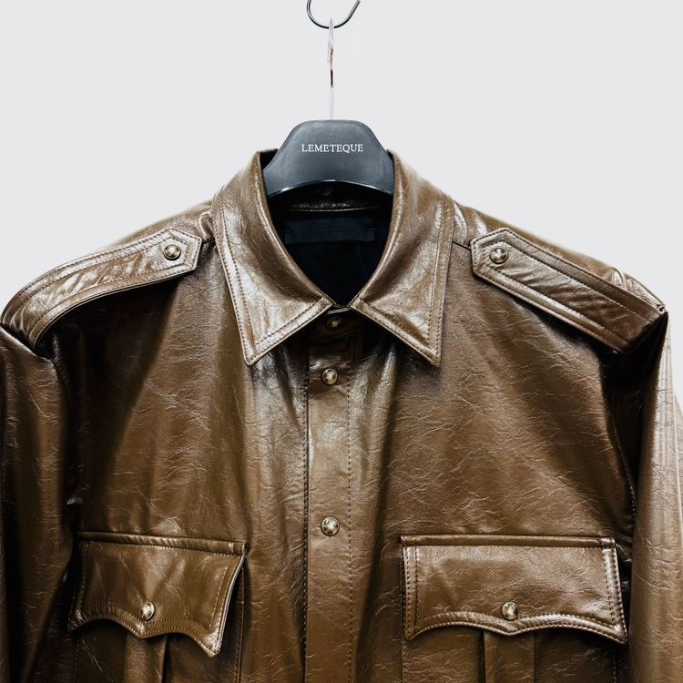 DARK BROWN LEATHER SAFARI SHIRT WITH PEARL BUTTON