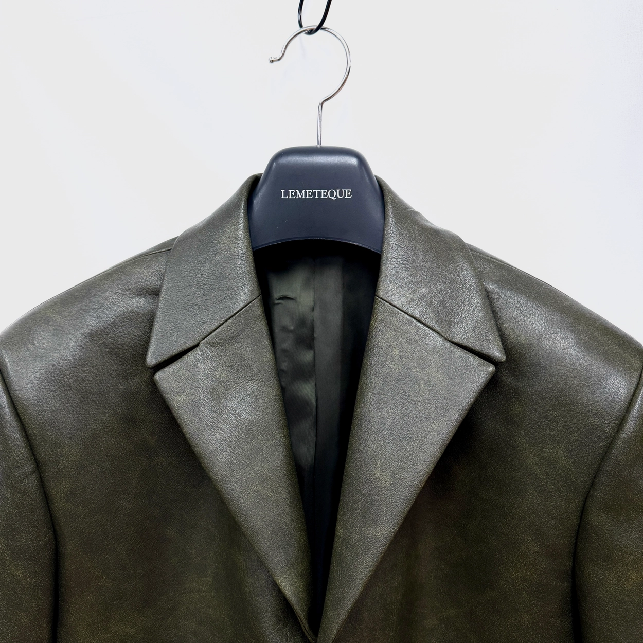 GREEN WRINKLED ENAMEL LEATHER SINGLE THREE PIECE SUIT WITH WIDE PANTS